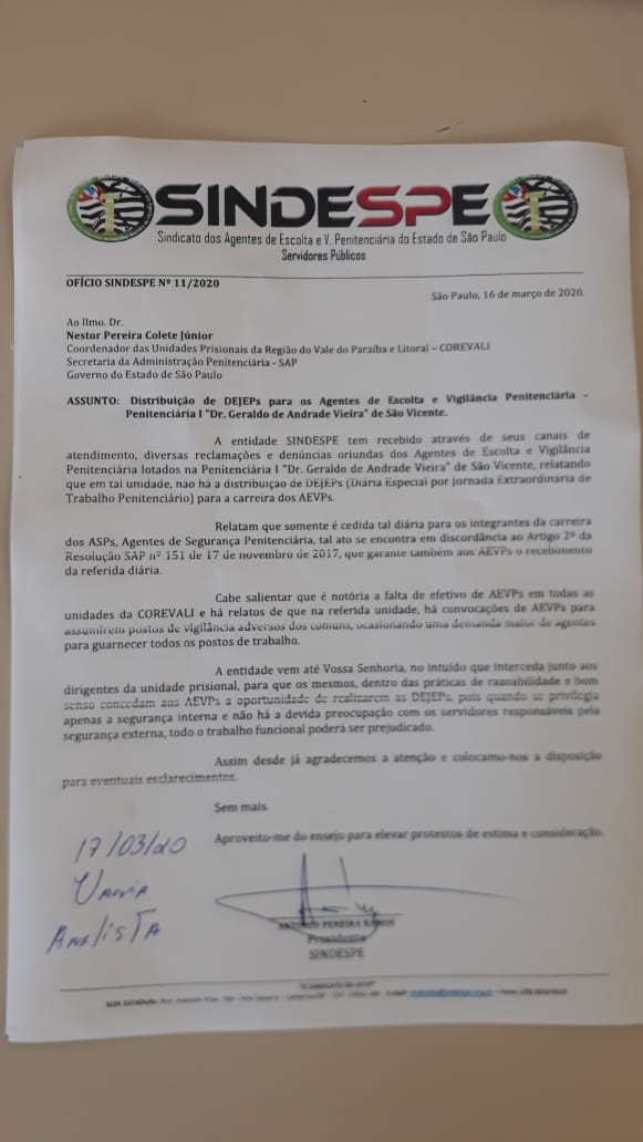 A entidade SINDESPE tem recebido através de seus canais de atendimento, diversas reclamações e denúncias oriundas dos Agentes de Escolta e Vigilância Penitenciária lotados na Penitenciária I “Dr. Geraldo de Andrade Vieira” de São Vicente, relatando que em tal unidade, não há a distribuição de DEJEPs (Diária Especial por Jornada Extraordinária de Trabalho Penitenciário) para a carreira dos AEVPs.