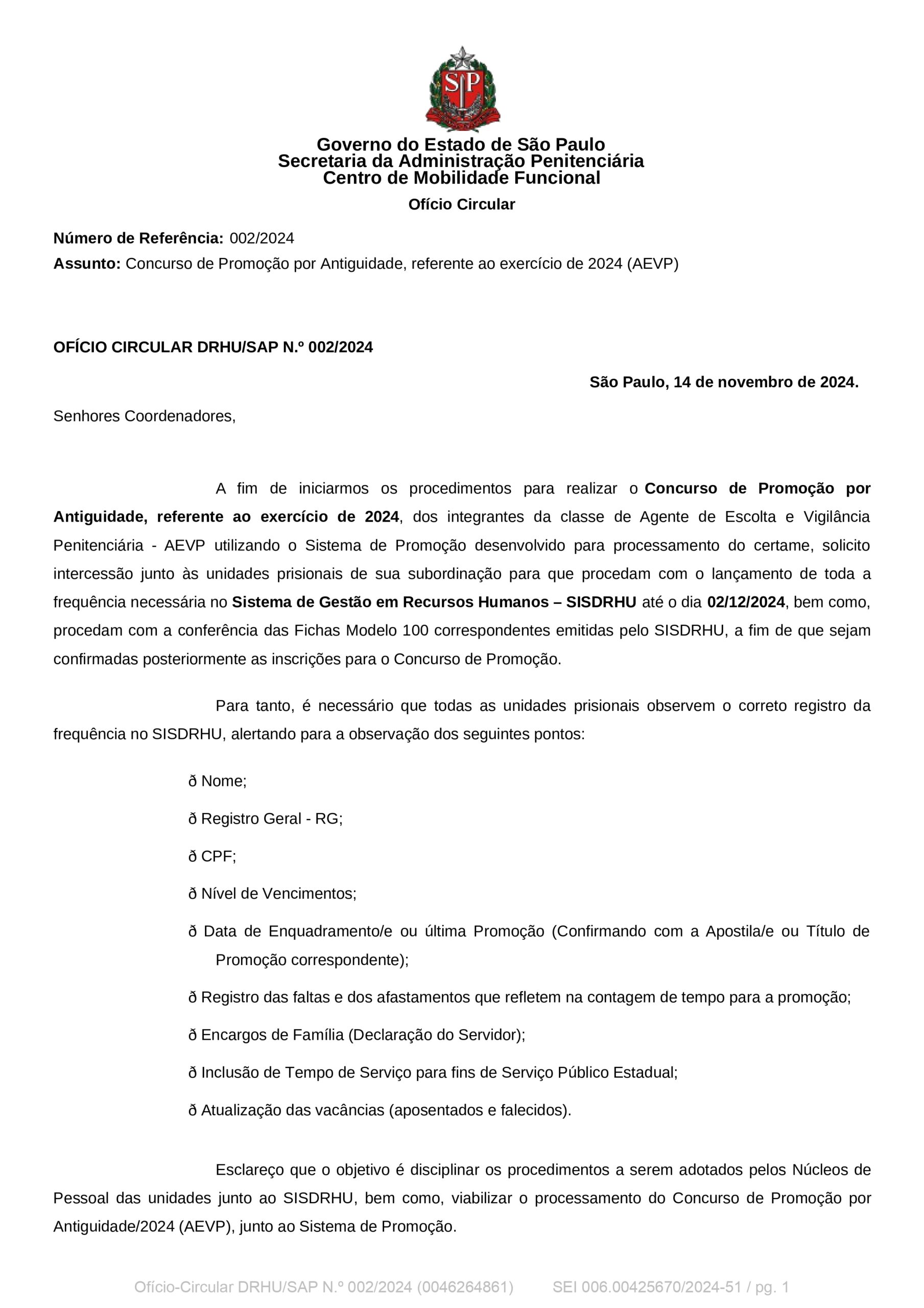 O Departamento de Recursos Humanos da SAP, publicou na data de hoje, 14 de novembro de 2024, um Ofício Circular endereçado aos Coordenadores, infomando o início dos procedimentos para a realização do “último” Concurso por Antiguidade para o cargo de Agente de Escolta e Vigilância Penitenciária, que no final deste ano será transformado em ” Policial Penal”.