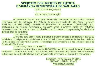 • Edital de convocação para discutir fusão das entidades para representar os Policiais Penais do Estado de São Paulo. 30/03/2026