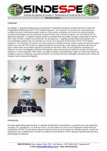 Levantamento feito pelo “SINDESPE” sobre apreensões de drogas nas cadeias da região de Campinas enviadas pelos “correios” 2020 “tiveram um acréscimo de 1000%”