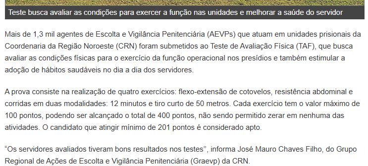 Agora veja abaixo na página do governo que em 2020 a “SAP” convocou “AEVPs” para fazerem “TAF” teste de aptidão física, veja qual foi a justificativa da Secretaria: O teste para avaliar condições para exercer sua função: o que mudou de 2020 para hoje.
