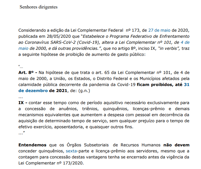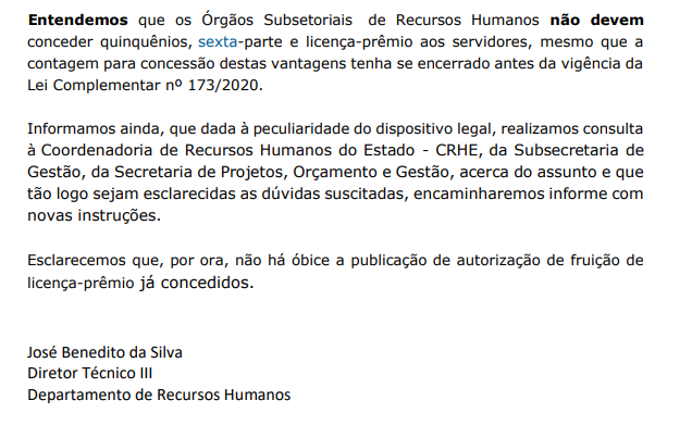 O Diretor do DHRU , não esta respeitando direito adquirido, em reunião com departamento jurídico data hoje dia 02/06/2020, ficou decidido que caso não sejam derrubados os vetos, vamos recorrer a justiça e enviar um ofício ao secretário da “SAP” para averiguar atitude do Diretor, proibindo mesmo que a contagem de tempo da concessão da vantagem tenha encerrado antes da vigência da LEI nº 173/2020, enviando circular a todas unidades prisionais, podendo ser responsabilizado por falta administrativa se for o caso, avalia o diretor jurídico.