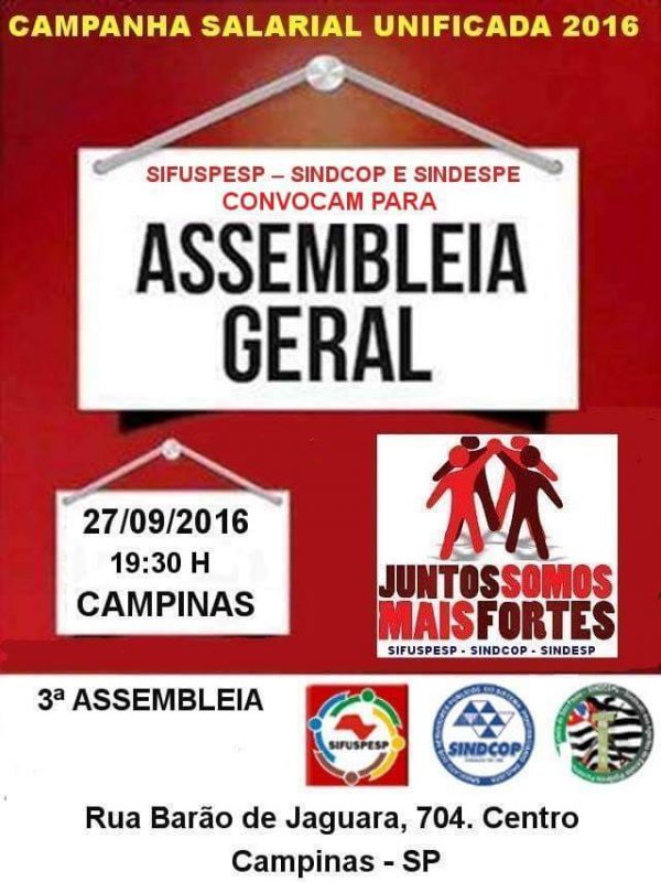 O Sindcop, o Sifuspesp e o Sindespe convocam os servidores de todo o sistema prisional paulista a participarem da 3ª Assembleia da Campanha Salarial Unificada 2016, a ser realizada nesta terça-feira, 27/09, a partir das 19h30, na sede do Sinticom(Sindicato dos Trabalhadores nas Indústrias de Construção e do Mobiliário de Campinas e Região). O Sinticom fica na rua Barão de Jaguará, 704, no Centro de Campinas. Na assembleia, serão debatidos…