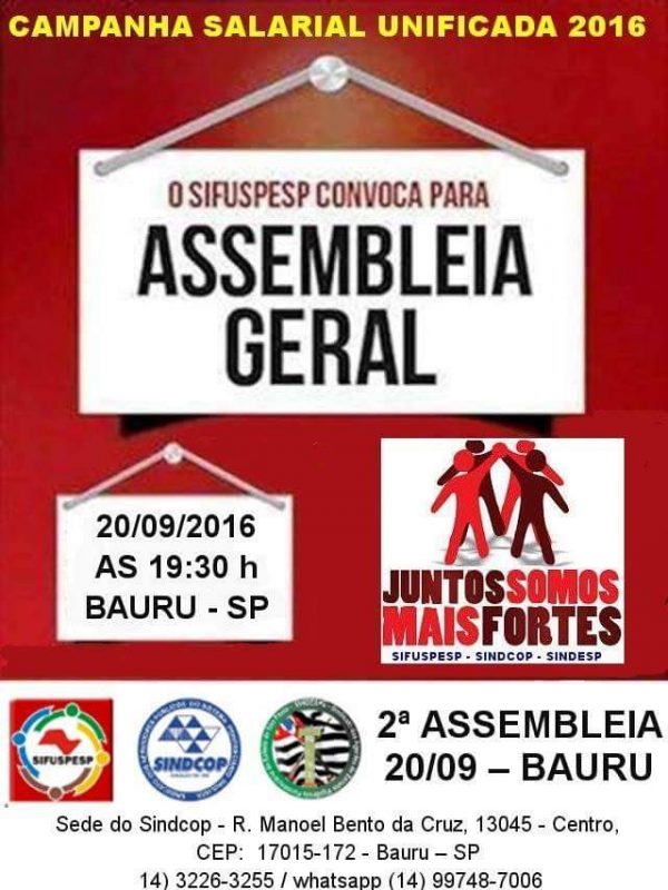 O Sindcop, o Sifuspesp e o Sindespe convocam os servidores de todo o sistema prisional paulista a participarem da 2ª Assembleia da Campanha Salarial Unificada 2016, a ser realizada na sede do Sindcop em Bauru, nesta terça-feira, 20/09, a partir das 19h30. Na assembleia, serão debatidos temas de interesse de todos os servidores, como a definição das prioridades para a campanha salarial unificada e esclarecimentos sobre projetos de lei e…
