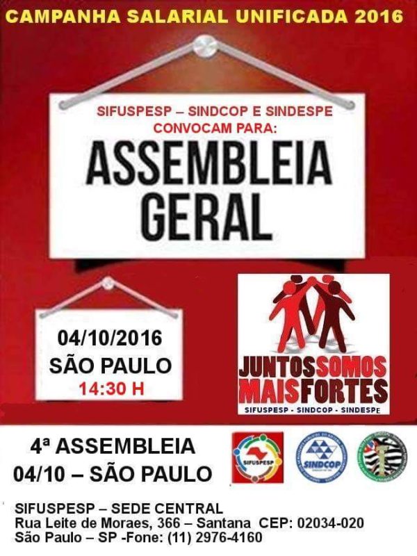 O SIFUSPESP, o SINDCOP e o SINDESPE realizam nesta terça-feira, 04/10, a 4a e última Assembleia da Campanha Salarial Unificada 2016. A assembleia acontece na sede do SIFUSPESP em São Paulo, a partir das 14h30. O endereço é a rua Leite de Morais, 366, em Santana, na zona norte da capital. Durante a reunião, serão debatidos temas e aprovadas pautas de interesse dos agentes de segurança penitenciária(ASPs), agentes de escolta e…