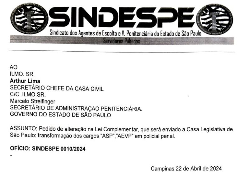 Sindespe protocola ofício para mudar a minuta da lei complementar de regulamentação da Polícia Penal que desagradou a maioria dos servidores.