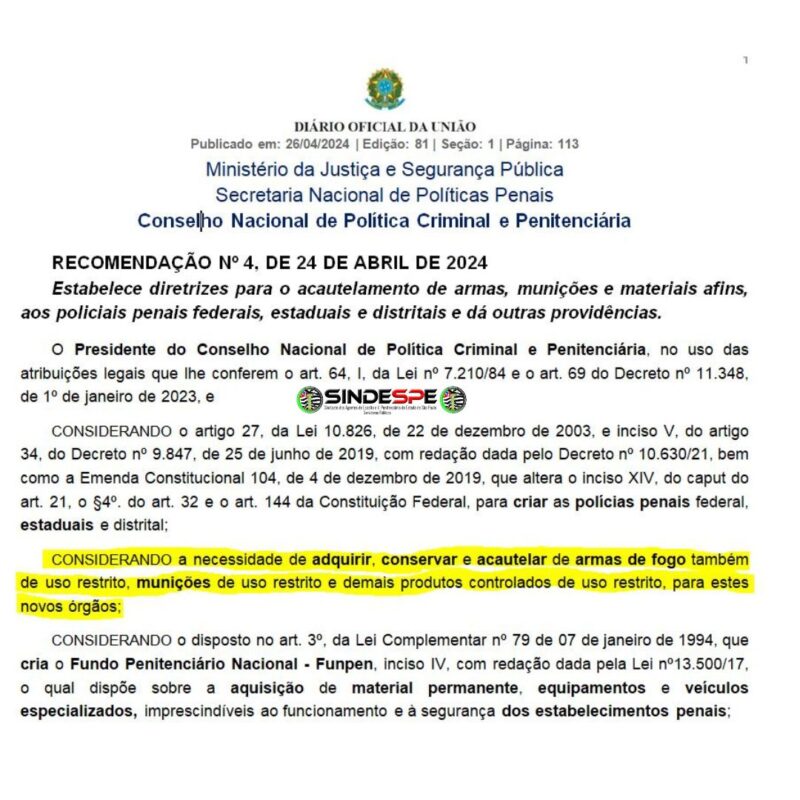 O Conselho Nacional de Políticas Criminal e Penitenciária recomenda que os estados realizem o acautelamento de arma de fogo aos seus Policiais Penais, “inclusive aos aposentados’. Foi publicado nesta semana, uma recomendação do CNPCP (Conselho Nacional de Política Criminal e Penitenciária), para que os Estados realizem o acautelamento de armas e produtos controlados (coletes balísticos e munições) aos seus Policiais Penais. Esta recomendação vem de encontro ao que o Sindespe…
