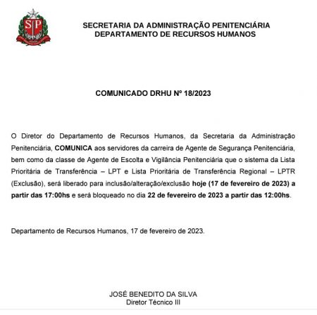 Foram reabertas na data de hoje, 23 de fevereiro, até o próximo domingo, dia 26 de fevereiro, as incrições na LPTE das bases de escolta, apenas para AEVPs que ficaram de fora das vagas previstas na primeira incrição e queiram mudar seu local de lotação. As vagas disponíveis serão estas abaixo: RESOLUÇÃO SAP Nº 28 DE 22-2-2023 Autoriza a alteração de opção dos servidores excedentes pertencentes à classe de Agente…