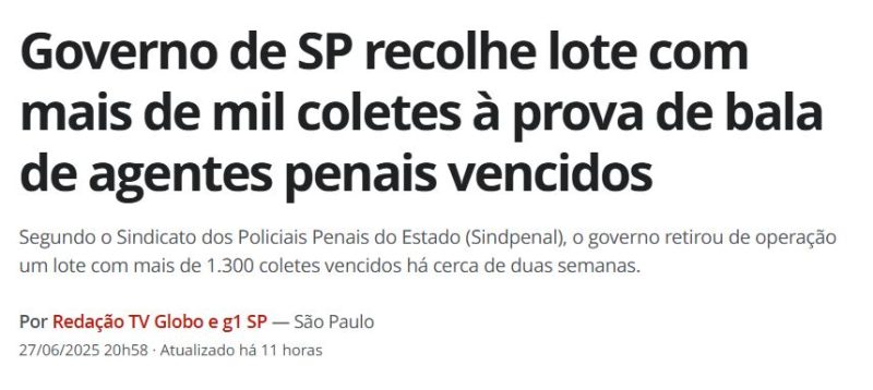 Coletes dos policiais penais vencidos: Na data de hoje a entidade foi informada pelos servidores que ontem após divulgação da matéria pela Rede Globo, os coletes vencidos que estavam na unidade prisional “Wellington Rodrigo Segura” de Presidente Prudente foram recolhidos, restando apenas 10 coletes na unidade.