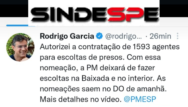 O Sindespe já participou varias reuniões com Secretário da pasta Coronel Restivo, é apresentou varias propostas entre elas uma equipe de escolta cada unidade prisional, o importante é que após vinte anos da criação do cargo “AEVP” policial penal vai se tornar realidade a escolta de presos feita pelos “AGENTES” a exemplo da capital desde 2014 . O governador Rodrigo Garcia autorizou nesta sexta-feira (20)de 2022, a contratação de 1.593…