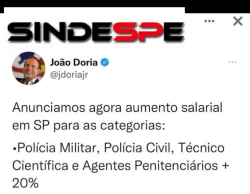 Em entrevista coletiva na tarde desta quinta feira o Governador do Estado João Dória anunciou o aumento salarial de 20% para todas as carreiras policiais do estado (incluindo agentes penitenciários) tanto da ativa quanto aposentados. Veja a entrevista completa abaixo: https://www.youtube.com/watch?v=0cT5p9R_t0A O projeto de lei do aumento salarial será enviado à ALESP até a próxima semana e valerá a partir de 1º de março. Confira como ficará o…