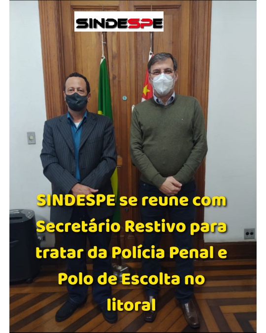 Estiveram reunidos hoje, dia 05 de julho de 2021, em São Paulo na Secretaria da Administração Penitenciária, o Presidente do SINDESPE senhor Antonio Pereira Ramos e o Secretário da pasta Coronel Nivaldo César Restivo, para tratar de assuntos de interesse da categoria dentre eles a votação da PEC04 da Polícia Penal, a posterior Lei Orgância da Polícia Penal, a transformação da Penitenciária Feminina de São Vicente em Centro de Progressão…