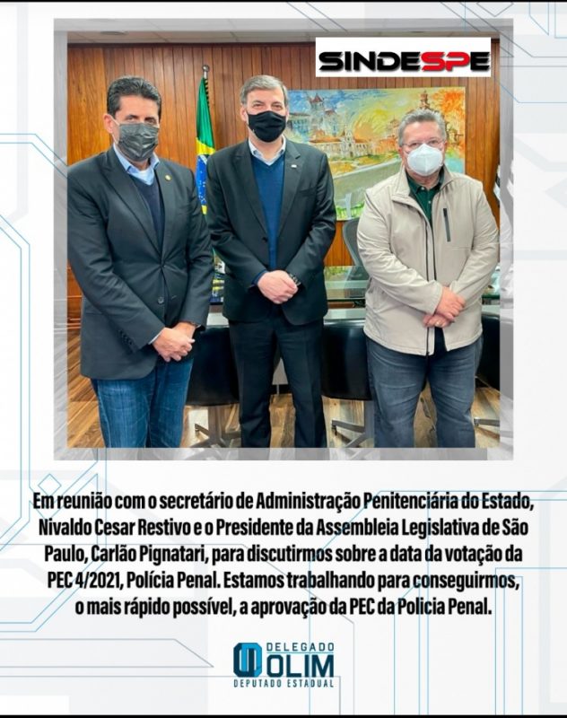 Estiveram reunidos na data de hoje na Secretaria de Administração Penitenciária com o Secretário da pasta, Coronel Restivo, o Presidente da ALESP Carlos Pignatari, e o Deputado Delegado Olim, autor da PEC 04 que cria a Polícia Penal do Estado de São Paulo. O objetivo da reunião foi discutir sobre a data da votação da PEC04 da Polícia Penal na ALESP, com apoio do Poder Executivo. Vale resssaltar que a…