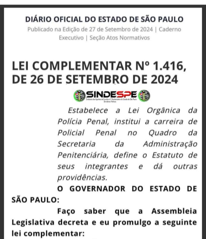 Acesse aqui a Publicação no Diário Oficial do Estado Abaixo o texto na íntegra: LEI COMPLEMENTAR Nº 1.416, DE 26 DE SETEMBRO DE 2024 Estabelece a Lei Orgânica da Polícia Penal, institui a carreira de Policial Penal no Quadro da Secretaria da Administração Penitenciária, define o Estatuto de seus integrantes e dá outras providências. O GOVERNADOR DO ESTADO DE SÃO PAULO: Faço saber que a Assembleia Legislativa decreta…