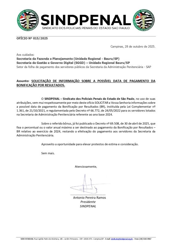 Na data hoje dia 28 outubro de 2025, após envio de ofício, fomos informados pela Secretaria da Fazenda do Estado de São Paulo, que nem tem data e nem previsão para pagamento do Bônus dos policiais penais do Estado de São Paulo.