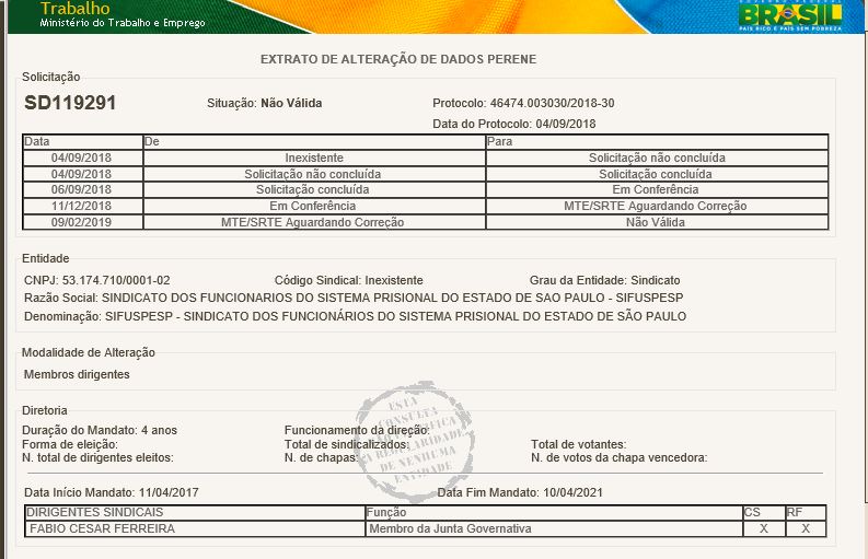 A referida entidade “SINDCOP” não poderia legalmente participar  do grupo de trabalho da polícia penal “GT”por  ter seu mandato vencido conforme dados do Ministério do trabalho abaixo: