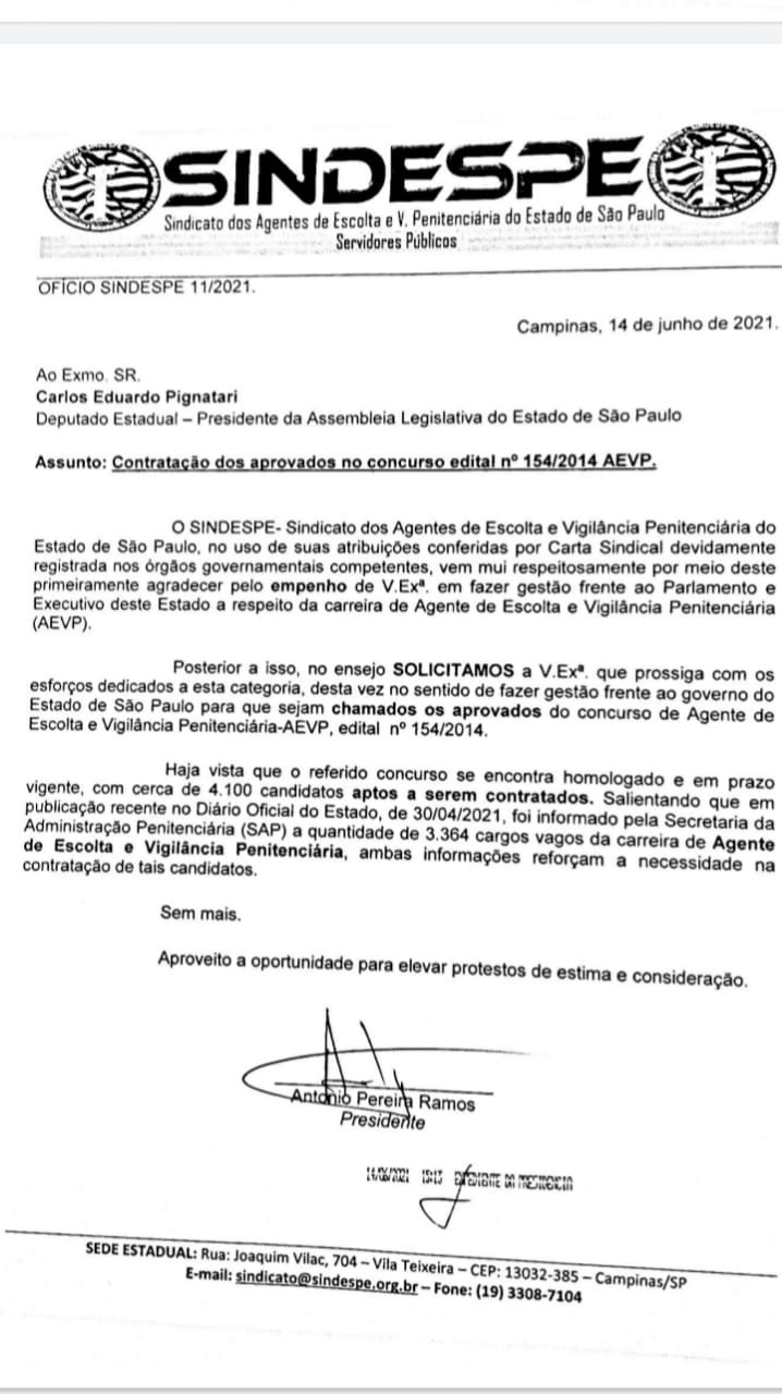 SINDESPE pede ao Presidente da ALESP que interceda junto ao poder executivo, pela contratação dos AEVPs oriundos do concurso 2014