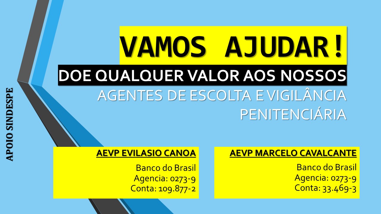 O Sindicato dos Agentes de Escolta e Vigilância Penitenciária – Sindespe mais uma vez vem pedir apoio aos agentes em recuperação, bem como agradecer a todo apoio dado a eles. Exemplo disto tem sido os vários gestos de apoio, contribuição e generosidade demonstrado por entidades sindicais distintas, instituições como Policia Miitar, até mesmo o próprio governo por meio da SAP e coordenadorias que dentro de suas possibilidades e meios tem se feito presente.