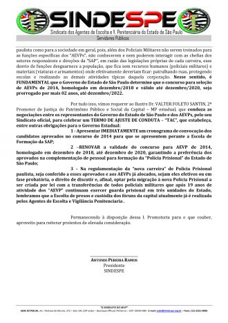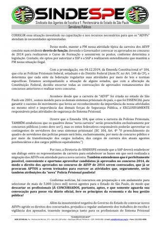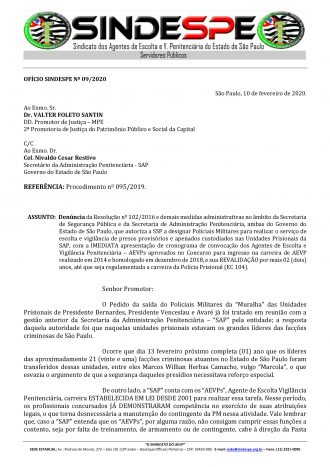 Sindicato entrega ofício a “SAP” e “MP” solicitando saída da Polícia Militar na unidades prisionais de Presidente Venceslau, Presidente Bernardes e Avaré, o objetivo principal é a transferência dos agentes que trabalham distante de suas residencias para que sejam transferidos para estas unidades prisionais e com a possibilidade de nomeações dos concursados 2014.