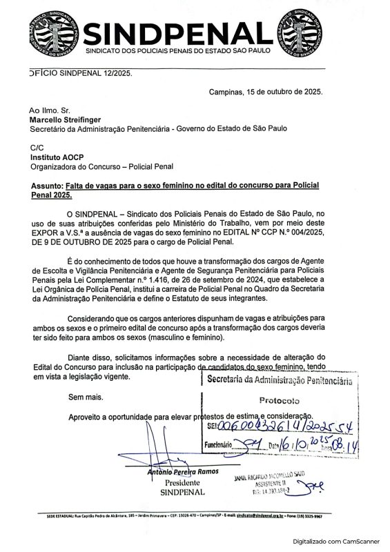 SINDPENAL pede alteração no edital “concurso policial penal 2025” com exigência do sexo masculino, ou a entidade vai entrar com ação judicial, assunto foi discutido ontem entre o presidente da entidade Sr. Antonio Pereira Ramos e o departamento jurídico.