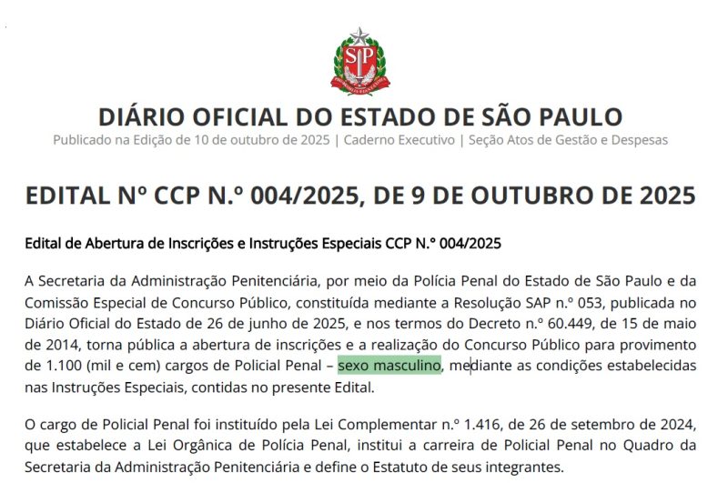 SINDPENAL pede alteração no edital “concurso policial penal 2025” com exigência do sexo masculino, ou a entidade vai entrar com ação judicial.